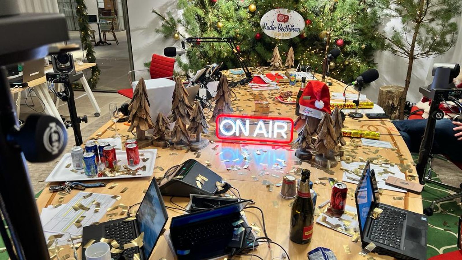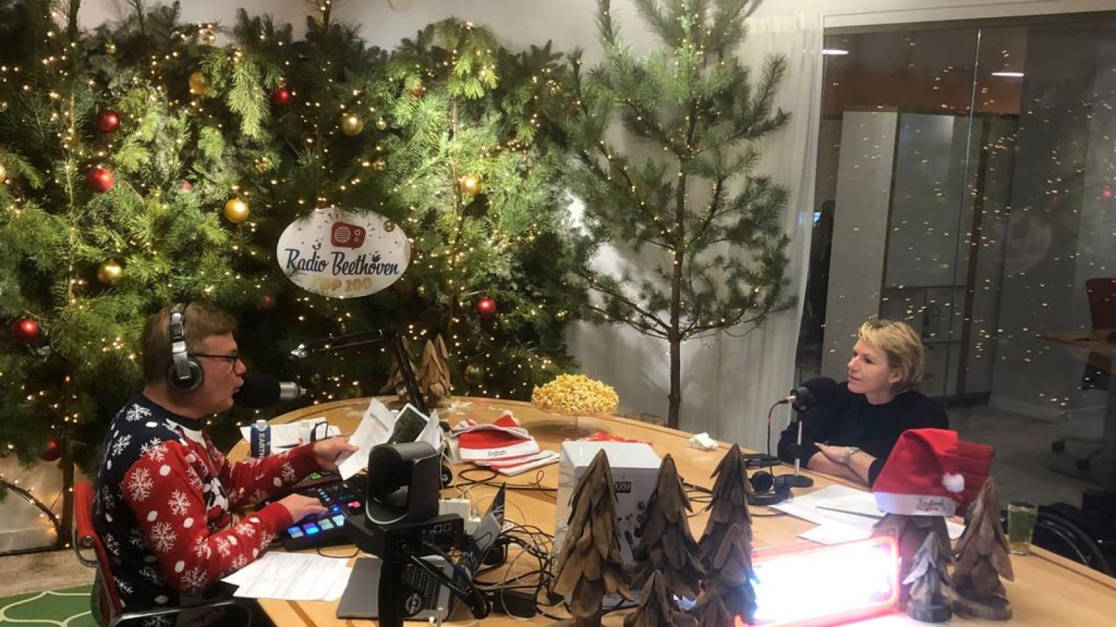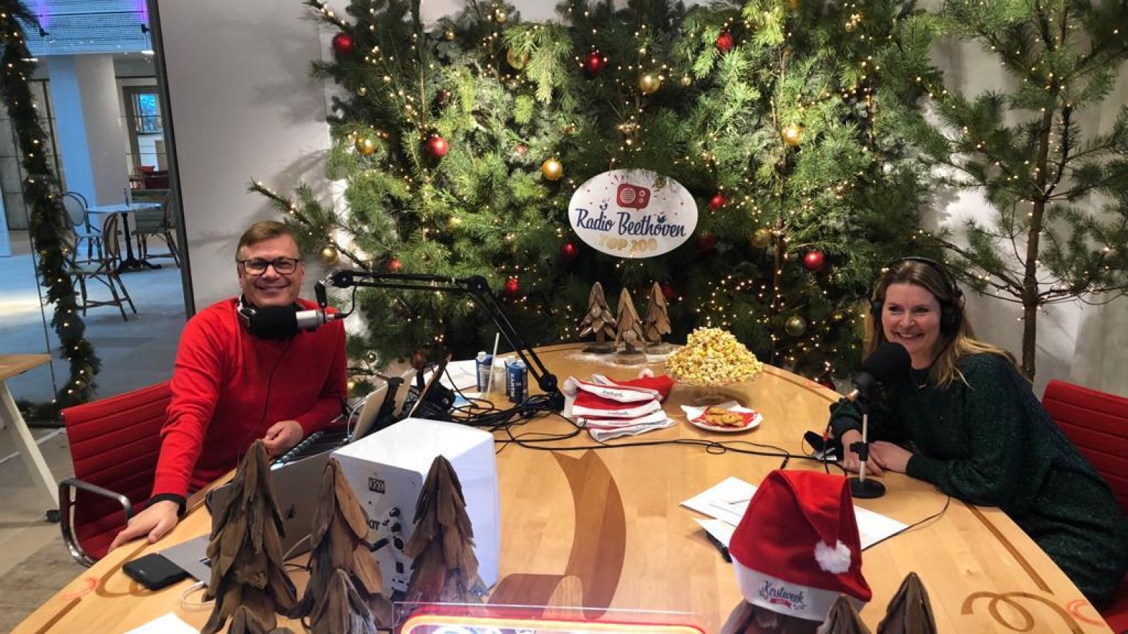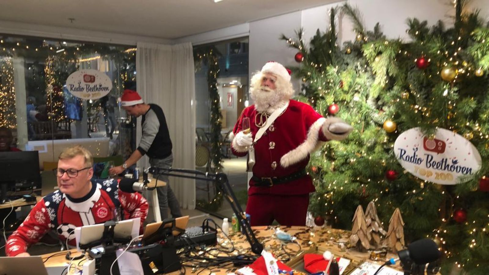 De kerstman op bezoek in de radio studio